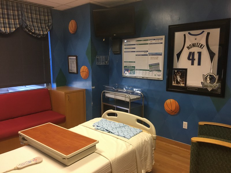 而在达拉斯长老会医院,我们看到了他们的医院文化理念是“提高您的生命质量”。是的,生命质量不仅在于生理健康,更在于心灵愉悦。在儿科病房,我们惊奇的发现进入了一个色彩斑斓的童话世界。将儿科的门诊或病房环境用卡通图案进行装点并不鲜见,但这家医院把这一点发挥到了极致。不仅仅是走廊墙壁,包括病房门、病房内墙、护士站全部都用绘画填满。而且难得的是,没有一处的图案是相同的,每一个病房都会有一个主题,小病号可以根据自己的喜好来选择房间,处处彰显着个性。我们被允许进入一间空病房参观,这是一间以篮球为主题的病房,门上是达拉斯小牛队的队徽,墙壁上挂着诺维斯基的41号球衣。一个小篮球迷在这样的环境中接受治疗,也许都不愿出院吧?