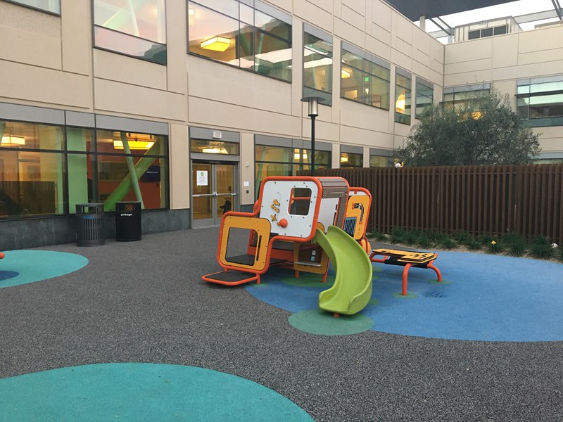 美国的医院普遍造价较高,在材料设备选用上往往不计成本,力争尽善尽美,对一些新技术新材料的运用也往往比较超前。这一点在参观加州大学旧金山分校医疗中心时感受尤为深刻,其位于Mission Bay校区的一栋刚刚启用一年多的儿童诊疗中心,面积9万平方米,总投资15亿美金。从一进门开始我们就感受到了一种高达上的科技范儿,墙壁上一个个无颜六色的圆盘吸引了来访者的目光,这是为了适应儿童的好奇心、缓解等候压力而专门设置的光学原理体验装置,几乎每个经过的人都会饶有兴趣地转上几圈,欣赏无颜六色的图案变化。而门诊大厅墙壁上硕大的彩屏在欢迎图案和文字的同时,也能感应到参观者的位置和身影,并将其叠加进显示内容中,从而产生互动。类似的设施还包括不断变换颜色的照明灯、用弹性十足的新型材料铺就的楼顶游乐场、带动态路线图的电子导向指示牌等等。这些高科技手段的运用,不但提升了医院的诊疗品质,也使得患者的就诊过程充满了惊喜和乐趣。