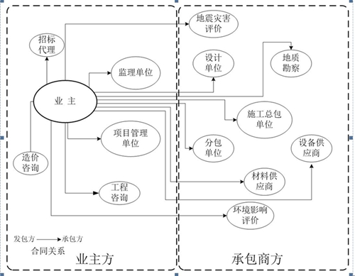 图1即对建设项目的直接参建方进行业主方和承包商方划分的示意。为了图示简洁,我们对其中参建单位合同关系只选取了全部由业主方进行发包的情况,而实际建设项目中,根据建设管理模式的的不同,合同关系可能并非图中一种类型,如分包单位、材料供应单位、设备供应单位、勘察单位可能与施工总包单位存在直接合同关系,但即使如此,由于业主在项目中投资人的地位,这些与业主没有直接合同关系的参建方也必须在业主的间接指挥与协调之下开展工作。