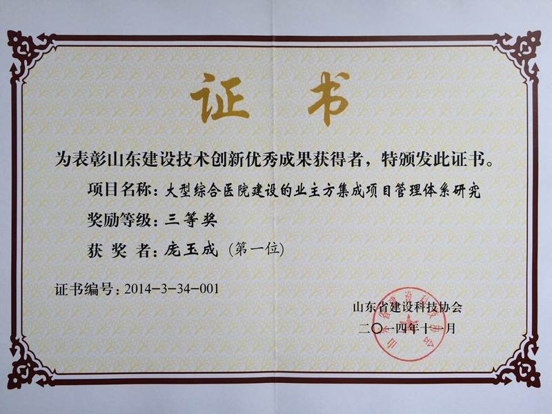 2014年11月,由滨州医学院bet5365首页所长庞玉成博士任项目负责人的山东省社会科学规划项目“大型综合医院建设的业主方集成项目管理体系研究”获山东建设技术创新优秀成果三等奖。